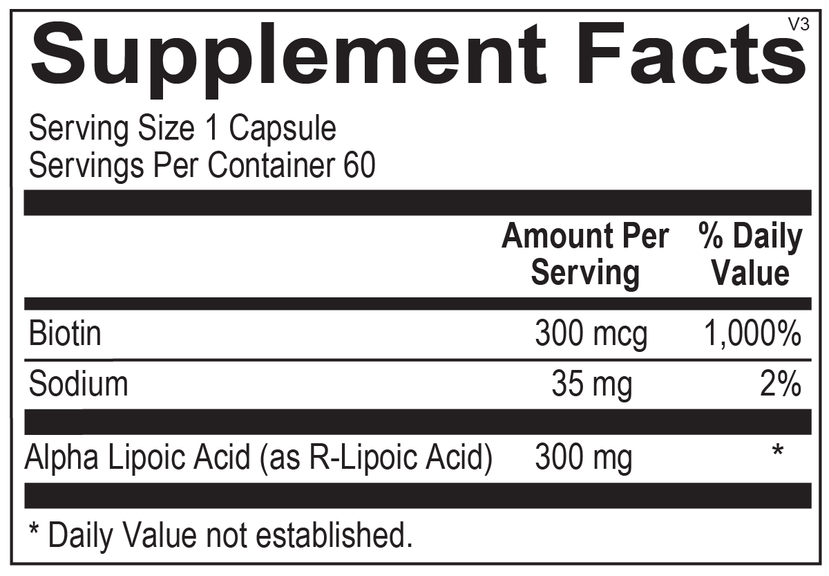 Supportive of a wide variety of health-related issues, ALA recharges vitamin E, vitamin C, glutathione and CoQ-10, and it directly quenches reactive oxygen species (ROS). Since it has water-soluble, fat-soluble and sulfhydryl properties, it can be utilized by many different bodily tissues in a variety of ways. Its unique chemical properties allow ALA to support healthy blood sugar levels. This formulation of Lipoic Acid contains 300 mg of ALA and 300 mcg of biotin to prevent biotin depletion by absorption competition between the two vital antioxidants.