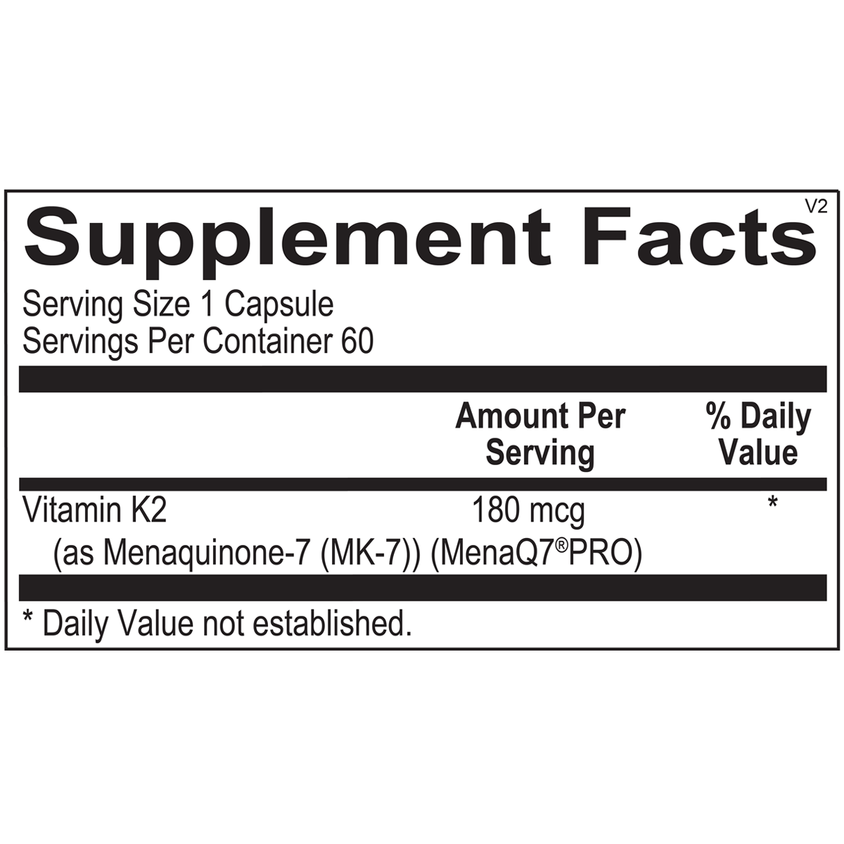 Vitamin K2 180 mcg is a high-concentration formula designed to support bone, cardiovascular and immune health. The formula includes MenaQ7® PRO, the most widely studied form of vitamin K2 as MK-7. Ortho Molecular Products is the exclusive supplier of MenaQ7® PRO.
