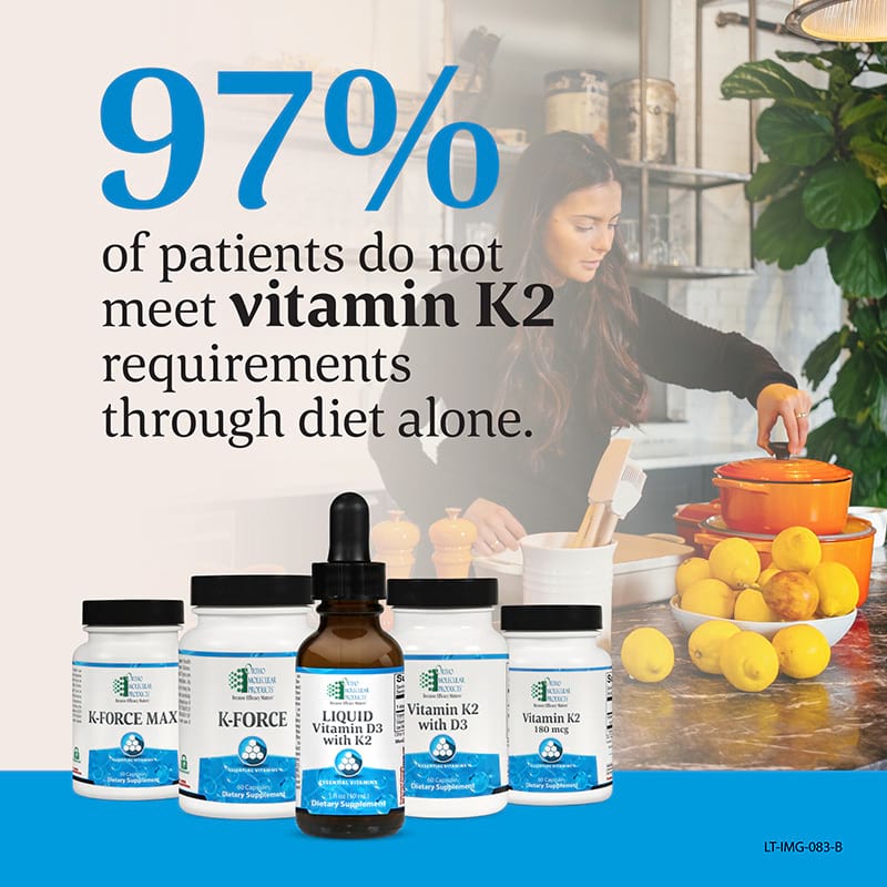 97% of Americans are deficient in vitamin K2, a powerful vitamin that is unfortunately almost absent from the American diet. Vitamin K2 acts like a calcium chaperone, making sure calcium is locked into the bones and kept out of the blood vessel wall. With an entire line of K2 products delivering the bioavailable form of vitamin K2, called MK-7, Ortho Molecular Products has an option for you. Ask our office today about these vitamin K2 products! #functionalmedicine #cardiovascular #bonehealth #MK7 #vitaminK2 #orthomolecularproducts #supplement #VitaminD3 #holistic #healthyVitaminD3andK2 #cardiometabolic